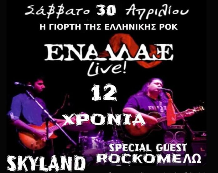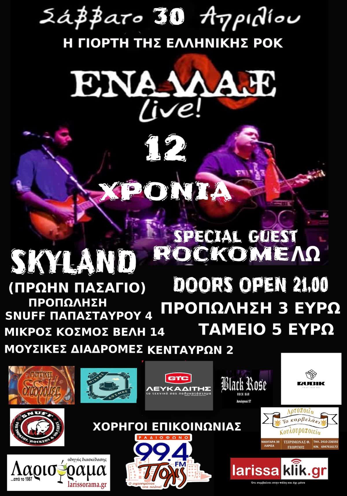 Την τελευταία ημέρα του Απριλίου το Skyland θα φιλοξενήσει μία γιορτή της Ελληνικής ροκ, οι Λαρισαίοι ΕΝΑΛΛΑΞ θα γιορτάσουν τα 12 χρόνια από την δημιουργία τους με μία ζωντανή εμφάνιση παρέα με τα φιλαράκια τούς τούς ROCKΟΜΕΛΩ σε μία βραδιά γεμάτη ενέργεια και Ροκ μελωδίες.