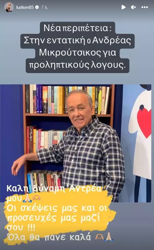 «Ελπίζω από εδώ και πέρα να κυλήσουν όλα καλά για την υγεία του» συμπλήρωσε η σύντροφος του παρουσιαστή. «Καλή δύναμη Αντρέα μου! Οι σκέψεις μας και οι προσευχές μας μαζί σου!!! Όλα θα πάνε καλά» σημείωσε χαρακτηριστικά η Κατερίνα Καινούργιου στην ιστορία που δημοσίευσε στον προσωπικό της λογαριασμό στο Instagram.