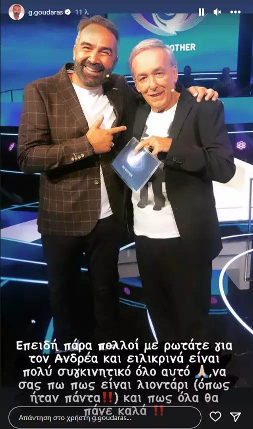 «Επειδή πάρα πολλοί με ρωτάτε για τον Ανδρέα και ειλικρινά είναι πολύ συγκινητικό όλο αυτό, να σας πω πως είναι λιοντάρι (όπως ήταν πάντα) και όλα θα πάνε καλά» τόνισε, με τη σειρά του, ο Γρηγόρης Γκουντάρας στα social media.