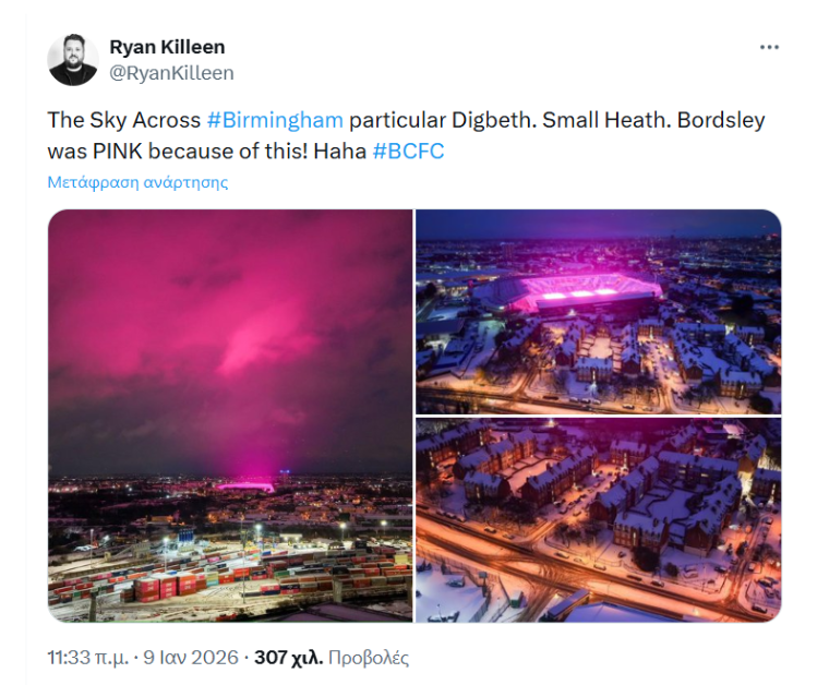 Ο ουρανός πάνω από τα Δυτικά Μίντλαντς – κομητεία στην Αγγλία – απέκτησε μια εκθαμβωτική ροζ απόχρωση το βράδυ της Πέμπτης, καθώς σημειώθηκε έντονη χιονόπτωση κατά τη διάρκεια της καταιγίδας Goretti.