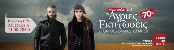 Με εκπτώσεις που φθάνουν έως και το 70% επί των αρχικών τιμών ξεκίνησαν τη Δευτέρα 13/1 και θα διαρκέσουν έως το τέλος Φεβρουαρίου οι χειμερινές εκπτώσεις στο Fashion City Outlet!!