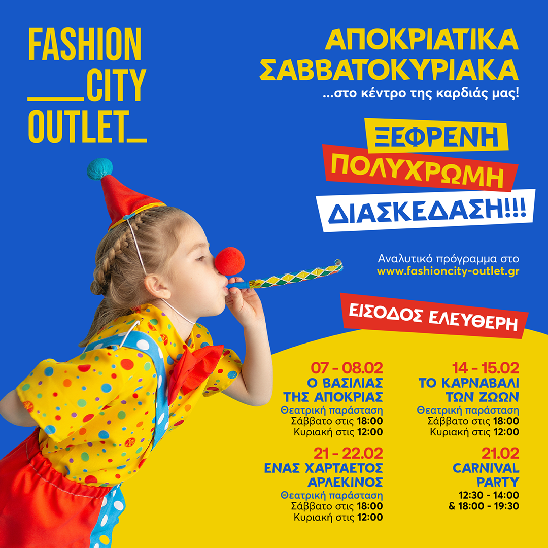 Τον Φεβρουάριο, το Fashion City Outlet φοράει τα αποκριάτικά του και προσκαλεί μικρούς και μεγάλους στα Αποκριάτικα Σαββατοκύριακα, με ένα πρόγραμμα γεμάτο φαντασία, χρώμα και διαδραστικές εμπειρίες για όλη την οικογένεια. Κάθε Σάββατο και Κυριακή, το εμπορικό κέντρο «της καρδιάς μας» μετατρέπεται σε σκηνή γιορτής, φιλοξενώντας παιδικές βιωματικές παραστάσεις και ένα θεότρελο ανοιχτό αποκριάτικο πάρτι, με ελεύθερη είσοδο.