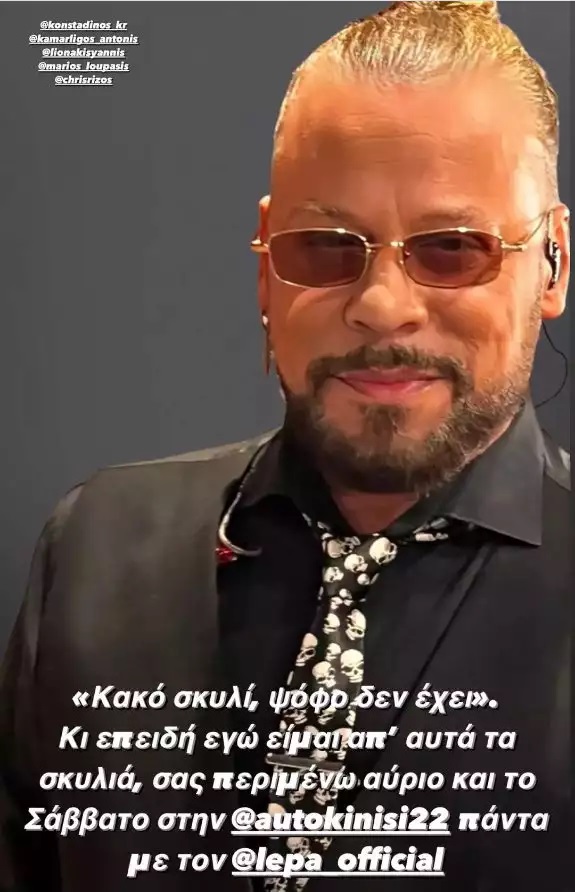«Κακό σκυλί, ψόφο δεν έχει. Και επειδή εγώ είμαι από αυτά τα σκυλιά, σας περιμένω αύριο και το Σάββατο στην Autokinissi22 πάντα με τον Λευτέρη Πανταζή», έγραψε χαρακτηριστικά σε Insta-Story του ο τραγουδιστής.