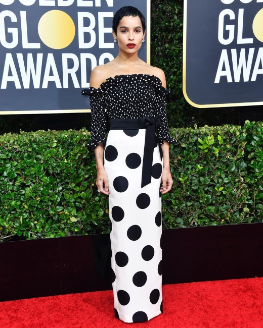 Η Zoe Kravitz με φόρεμα Saint Laurent που έχει polka dots prints σε διαφορετικά size και off shoulder top.