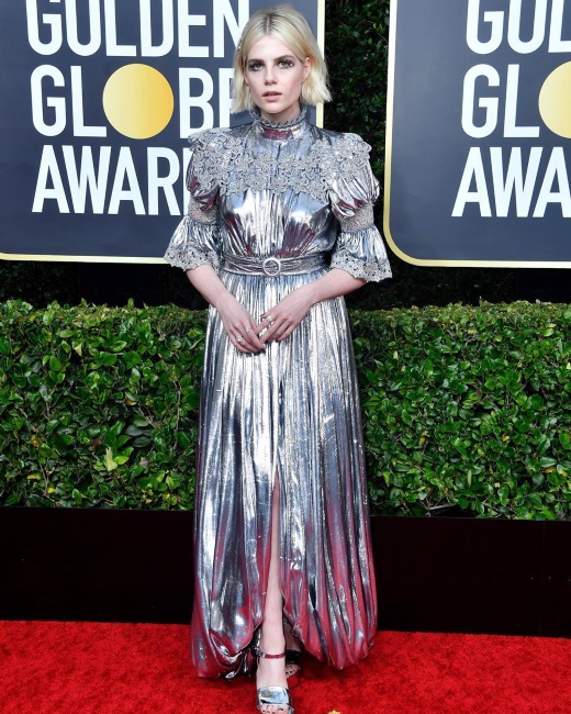 Η Lucy Boyton με metallic φόρεμα του οίκου Louis Vuitton που έχει floral και ντραπέ σχέδια, με πέδιλα σε ίδιο ύφος