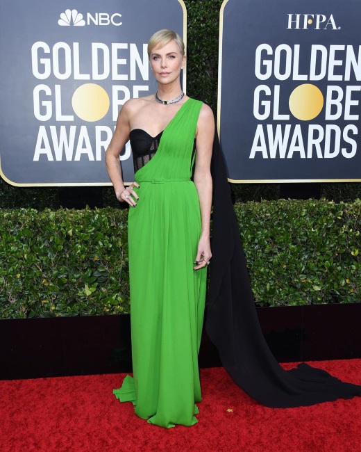 Η Charlize Theron με one shoulder φόρεμα Dior σε πράσινο χρώμα και bustier top με εντυπωσιακή ουρά.
