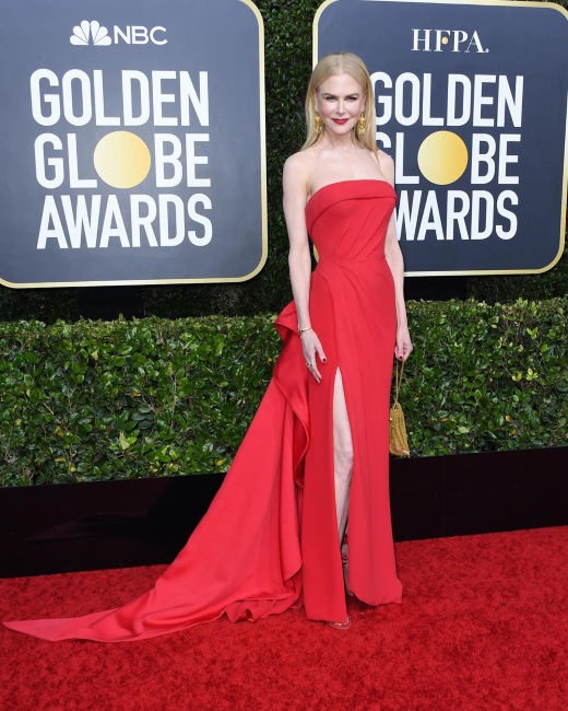 H Nicole Kidman με strapless red gown του οίκου Versace και gold accessories σε vintage style.