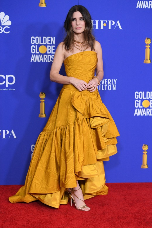H Sandra Bullock με strapless gown σε yellow egg απόχρωση και ντραπέ σχέδια που συνδύασε με gold πέδιλα.