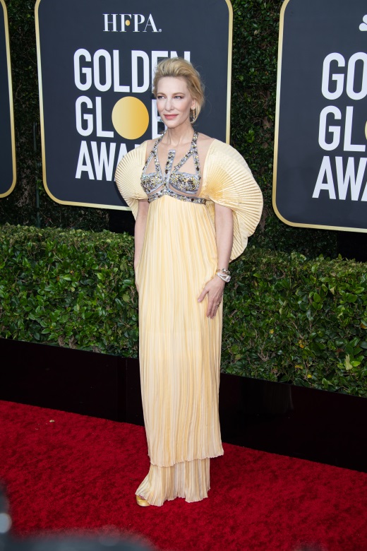 Η Cate Blanchett με grecian chic φόρεμα της Mary Katrantzou σε κίτρινο χρώμα με jewerly details στο πάνω μέρος.