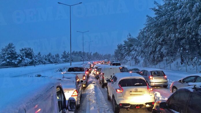 Όπως ήταν αναμενόμενο η διακοπή κυκλοφορίας έχει προκαλέσει τεράστια ταλαιπωρία στους οδηγούς που βρίσκονται ακινητοποιημένοι στα αυτοκίνητά τους μέσα στο χιόνι περιμένοντας τις υποδείξεις της Τροχαίας για αναστροφή.