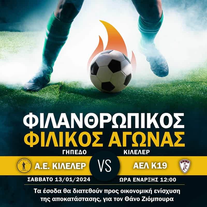 - 12:00 Φιλανθρωπικός φιλικός ποδοσφαιρικός αγώνας ΑΕ Κιλελέρ – ΑΕΛ Κ19 στο γήπεδο της ΤΚ Κιλελέρ.