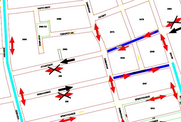 - Μονοδρόμηση της οδού Ατλαντίδος από την οδό Ακαδημίας μέχρι την οδό Αχιλλέως (Ο.Τ. 246Α, Ο.Τ. 235) με φορά κίνησης από οδό Ακαδημίας προς την οδό Αχιλλέως