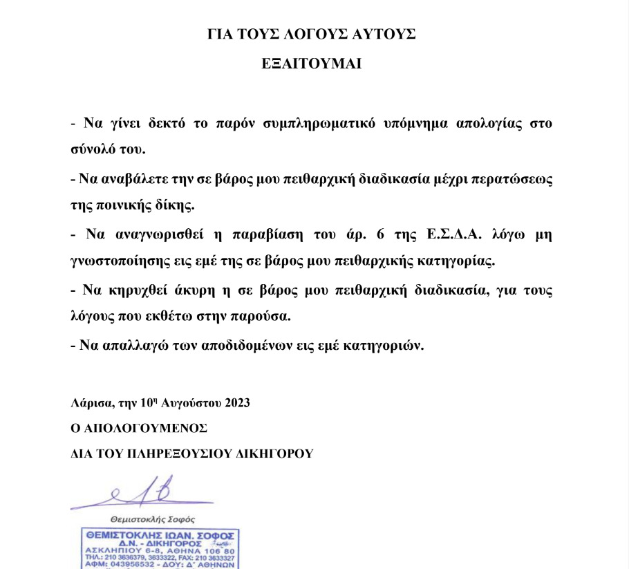 Τα αιτήματά του στο απολογητικό υπόμνημα