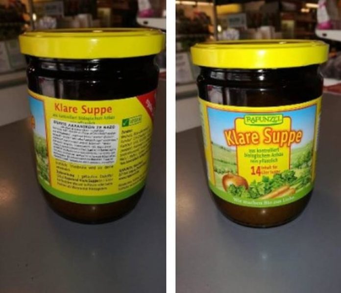 Συγκεκριμένα, ο ΕΦΕΤ ενημερώθηκε, για τη διακίνηση ζωμού λαχανικών σε σκόνη, το οποίο ενδέχεται να περιέχει ξένο σώμα (θραύσματα γυαλιού). Συγκεκριμένα, πρόκειται για το προϊόν «Klare Suppe» με εμπορική ονομασία «Rapunzel», γερμανικής προέλευσης, σε γυάλινο βάζο των 250 γρ., με αριθμό γραμμοκώδικα ΕΑΝ 4006040271017 και ημερομηνία ανάλωσης κατά προτίμηση πριν από 18.09.2020.