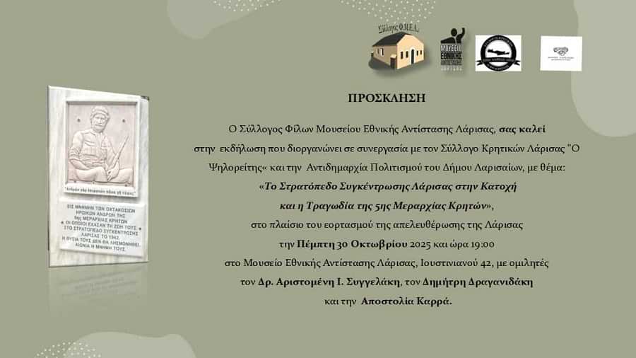 Εκδήλωση με θέμα: «Το Στρατόπεδο Συγκέντρωσης Λάρισας στην Κατοχή και η Τραγωδία της 5ης Μεραρχίας Κρητών», διοργανώνει ο Σύλλογος Φίλων του Μουσείου Εθνικής Αντίστασης Λάρισας, σε συνεργασία με τον Σύλλογο Κρητικών Λάρισας “Ο Ψηλορείτης” και την Αντιδημαρχία Πολιτισμού του Δήμου Λάρισας, τιμώντας την 81η επέτειο της απελευθέρωσης της πόλης από τη Γερμανική Κατοχή. Η εκδήλωση θα πραγματοποιηθεί στο Μουσείο Εθνικής Αντίστασης Λάρισας, Ιουστινιανού 42, αύριο Πέμπτη 30 Οκτωβρίου 2025 και ώρα 19:00.