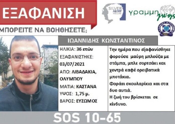 Ο Κωνσταντίνος Ιωαννίδης, 36 ετών, την 03/07/21 εξαφανίστηκε από την περιοχή Λιβαδάκια, Ολύμπου. Έχει καστανά μάτια, ύψος 1,75μ και είναι εύσωμος.
