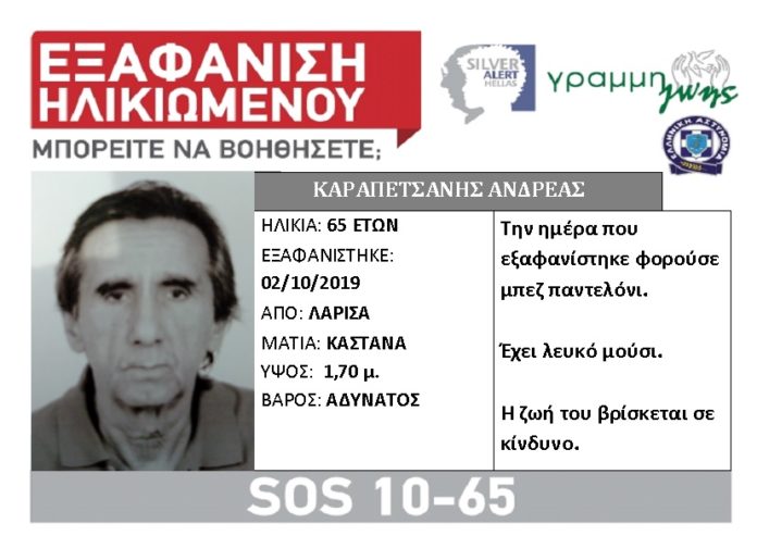 ΛΑΡΙΣΑ Εξαφανίστηκε 65χρονος Λαρισαίος 5 Οκτωβρίου 2019 Εξαφανίστηκε ο 65χρονος Λαρισαίος Ανδρέας Καραπετσάνης στις 2 Οκτωβρίου 2019 από την περιοχή της Λάρισας. Όποιος γνωρίζει κάτι ας επικοινωνήσει με την υπηρεσία Silver Alert, όλο το 24ωρο, στην Εθνική Γραμμή SOS 1065.