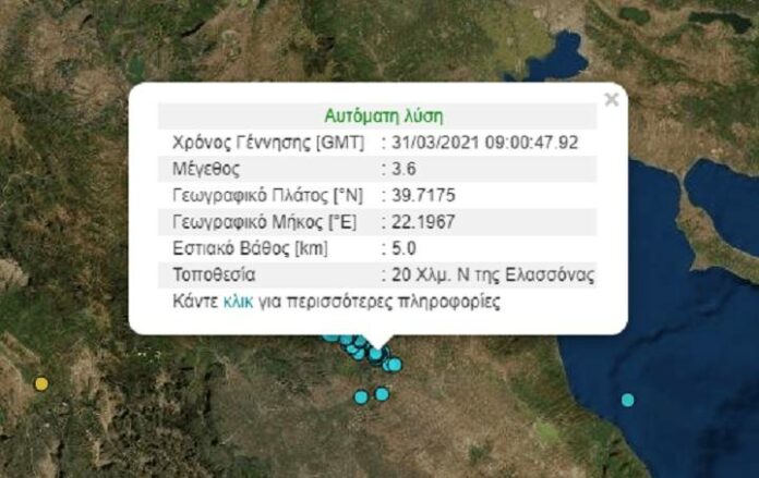 Σύμφωνα με το Γεωδυναμικό Ινστιτούτο του Εθνικού Αστεροσκοπείου Αθηνών μετασεισμός 3,7 Ρίχτερ καταγράφηκε στις 12.00 το μεσημέρι της Τετάρτης στην ευρύτερη περιοχή της Ελασσόνας.
