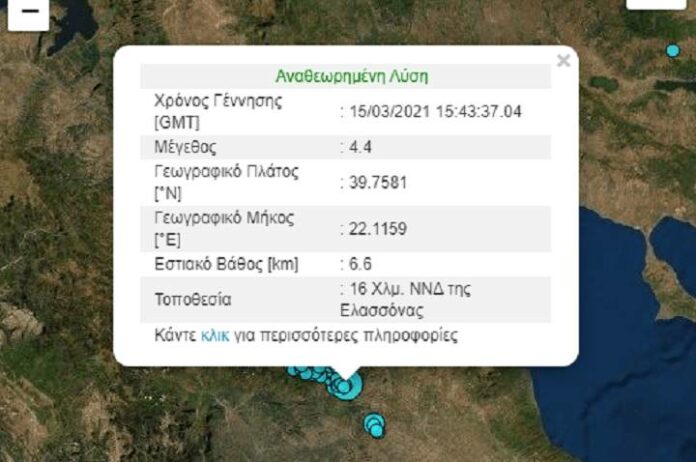 Σύμφωνα με το Γεωδυναμικό Ινστιτούτο στις 17:43 η σεισμική δόνηση ήταν μεγέθους 4.4 βαθμών της κλίμακας Ρίχτερ, 16 χιλιόμετρα ΝΝΔ της Ελασσόνας και σε βάθος 6,6 km.