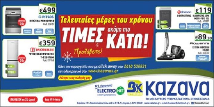 Τελευταία ημέρα του 2020 και στην ELECTRONET B.K. KAZANA οι προσφορές δεν πάνε πιο κάτω! Δείτε στο www.kazanas.gr ή καλέστε στο 2410536631 για τις super προσφορές και παραλάβετε άμεσα με click away, οτιδήποτε χρειάζεστε για δώρα στους αγαπημένους σας ή στον εαυτό σας!