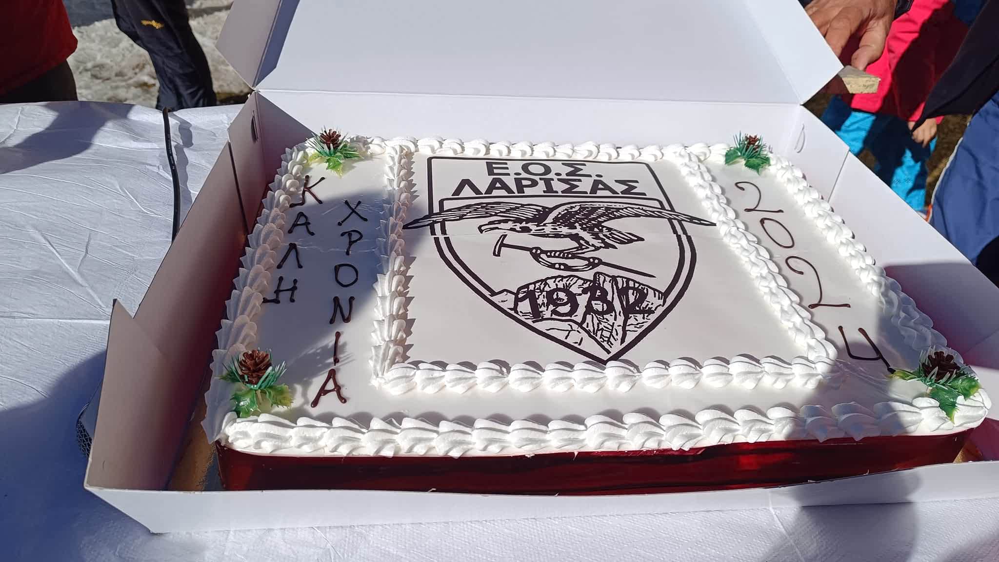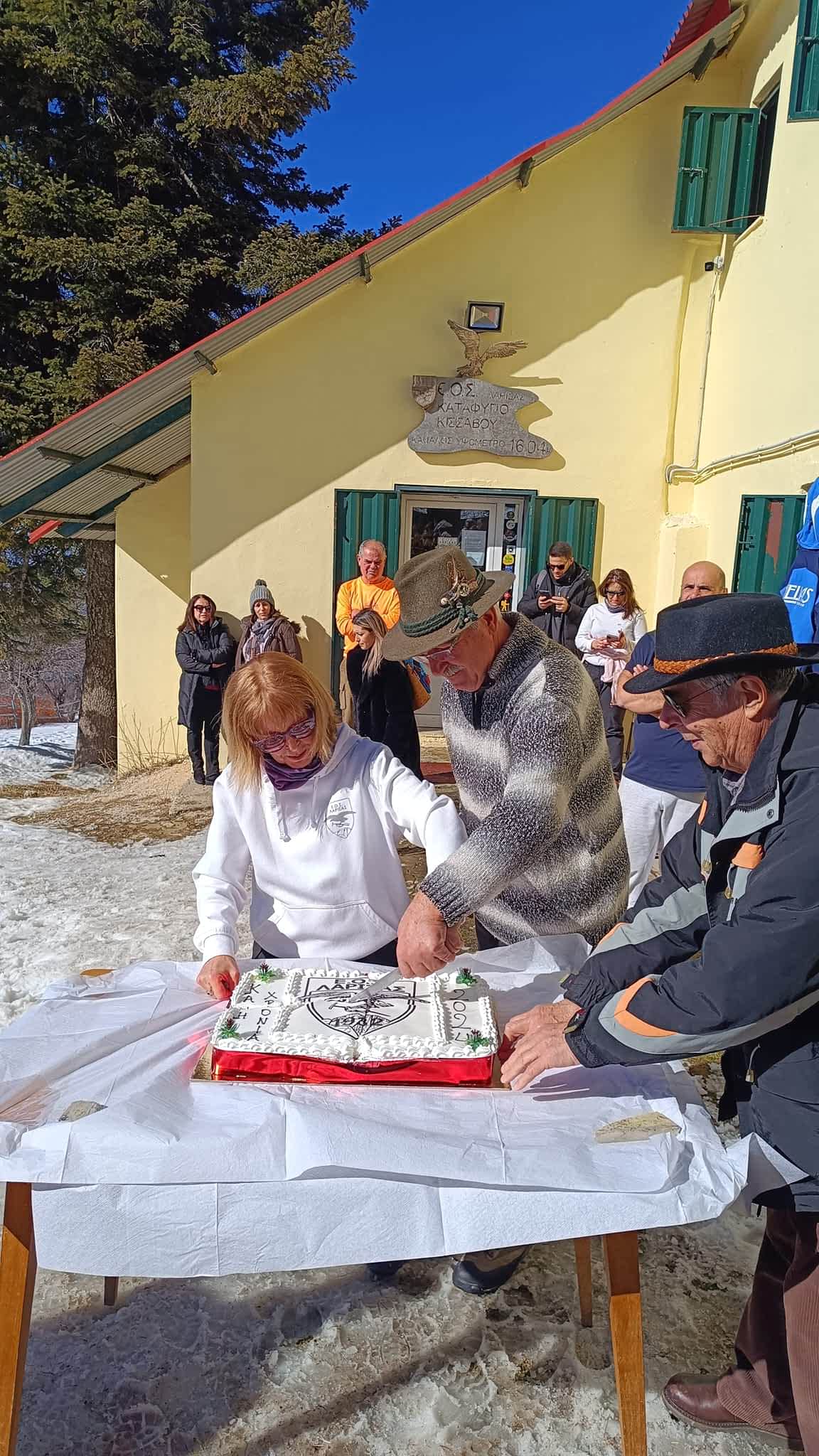 Κοπή ορειβατικής πίτας στο καταφύγιο Κισσάβου. Προηγήθηκε ανάβαση στην κορυφή του Κισσάβου 1978μ. Λόγω της υπέροχης μέρα με πολύ ήλιο η κοπή έγινε στο προαύλιο του καταφύγιου. Ο τυχερός που βρήκε το φλουρί ήταν ο επίτιμος πρόεδρος Αχιλλέας Παπαχατζής. (Πρόεδρε να είσαι πάντα τυχερός).