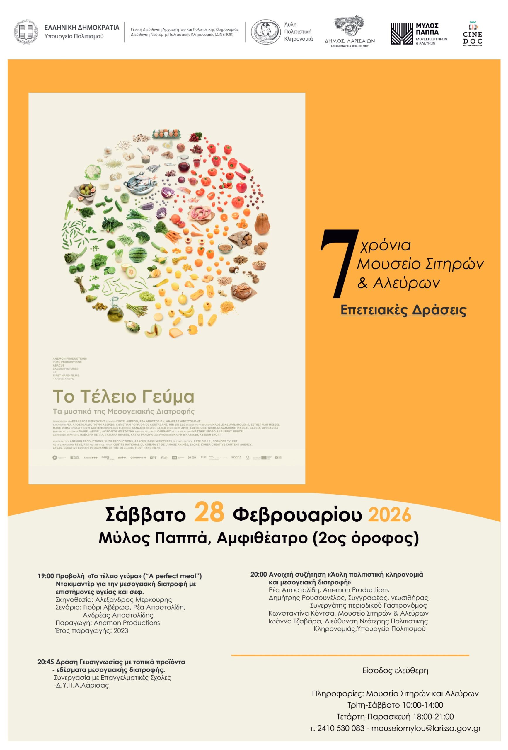 Γιορτάζοντας τα επτά χρόνια λειτουργίας του, το Μουσείο Σιτηρών και Αλεύρων διοργανώνει μια σειρά δράσεων για το κοινό της πόλης με επίκεντρο την μεσογειακή διατροφή, καλώντας μικρούς και μεγάλους σε μια συνειδητή επανανακάλυψη και επαναθεώρηση της διατροφικής εμπειρίας, το Σάββατο 28 Φεβρουαρίου 2026, στο χώρο του Μουσείου, στον Μύλο του Παππά..
