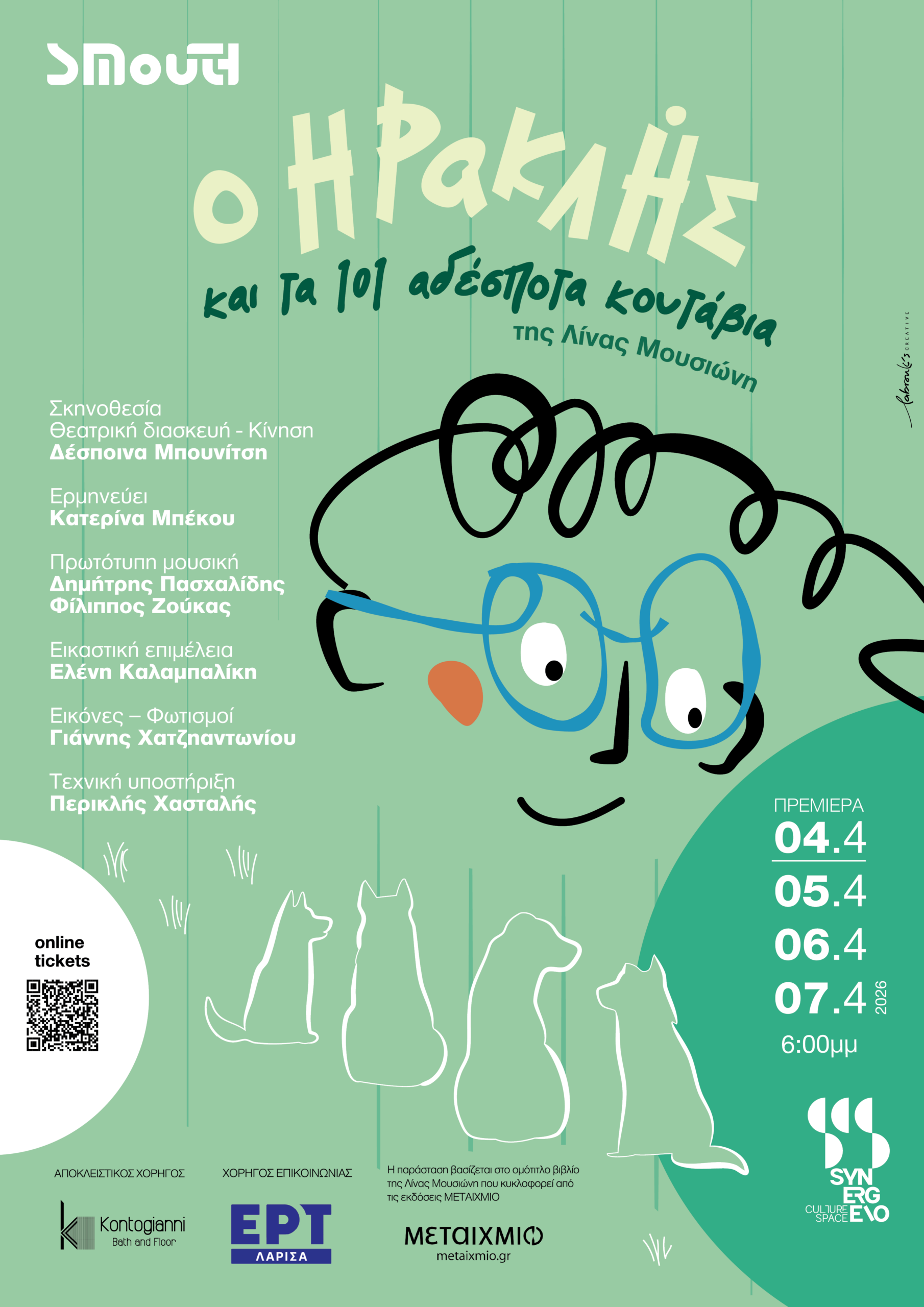 Το Συνεργείο Μουσικού Θεάτρου (ΣΜουΘ) προσκαλεί τους μικρούς του φίλους σε μια ξεχωριστή θεατρική εμπειρία: Η νέα παιδική παράσταση «Ο Ηρακλής και τα 101 αδέσποτα κουτάβια», βασισμένη στο ομώνυμο βιβλίο (εκδόσεις Μεταίχμιο) της Λαρισαίας συγγραφέως Λίνας Μουσιώνη έρχεται στη σκηνή του SYNERGEIO Χώρος Πολιτισμού στη Λάρισα γεμάτο μουσική, παιχνίδι και φαντασία.