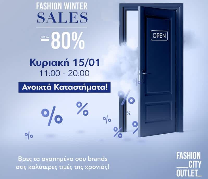 Ειδικά για την Κυριακή 15 Ιανουαρίου τα καταστήματα στο Fashion City Outlet θα είναι ανοικτά από τις 11 το πρωί ως τις 8 το βράδυ.