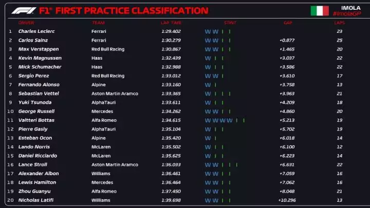 Η Ferrari σάρωσε στις πρώτες δοκιμές της Ίμολα, δείχνοντας για ακόμα μία φορά τη δυναμική της στο φετινό πρωτάθλημα της Formula 1. Ο Σαρλ Λεκλέρ ήταν ο ταχύτερος πιλότος, με τον Κάρλος Σάινθ να τον ακολουθεί.