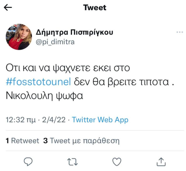 - Παρ’ όλα αυτά, στη συνέχεια, η Δήμητρα Πισπιρίγκου παρενέβη τηλεφωνικά στο «Φως στο Τούνελ», μίλησε με την Αγγελική Νικολούλη και υποστήριξε πως δεν έκανε εκείνη την εν λόγω διαδικτυακή ανάρτηση, αλλά δεν θέλησε να μιλήσει στον «αέρα» της εκπομπής.