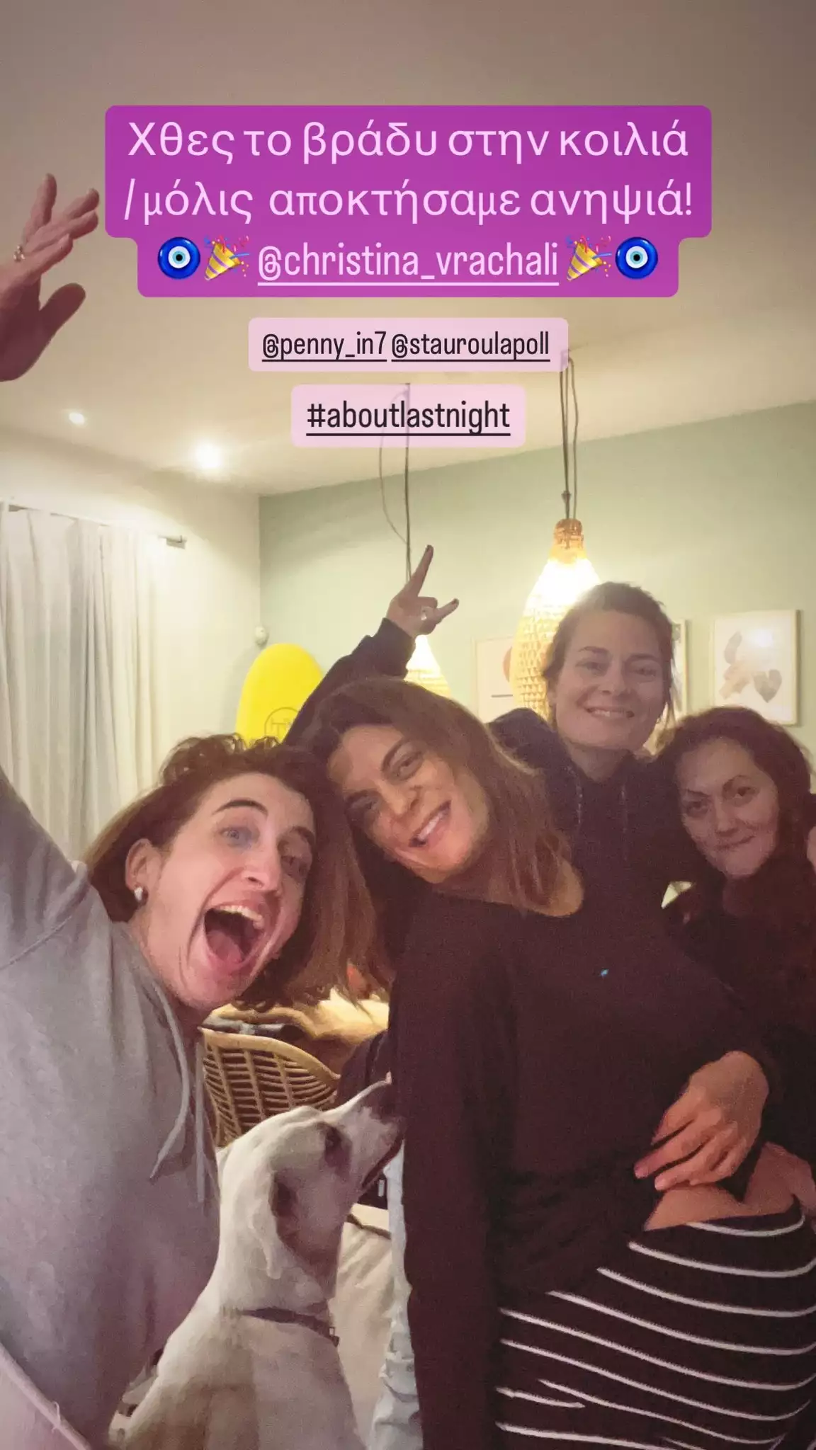 Πιο συγκεκριμένα, η Δανάη Λουκάκη δημοσίευσε στο Instagram μια φωτογραφία που τράβηξαν το βράδυ της Τρίτης 19/12 στο σπίτι της Χριστίνας Βραχάλη μαζί με δυο ακόμη φίλες τους και έγραψε, «Χθες το βράδυ στην κοιλιά, μόλις αποκτήσαμε ανηψιά».