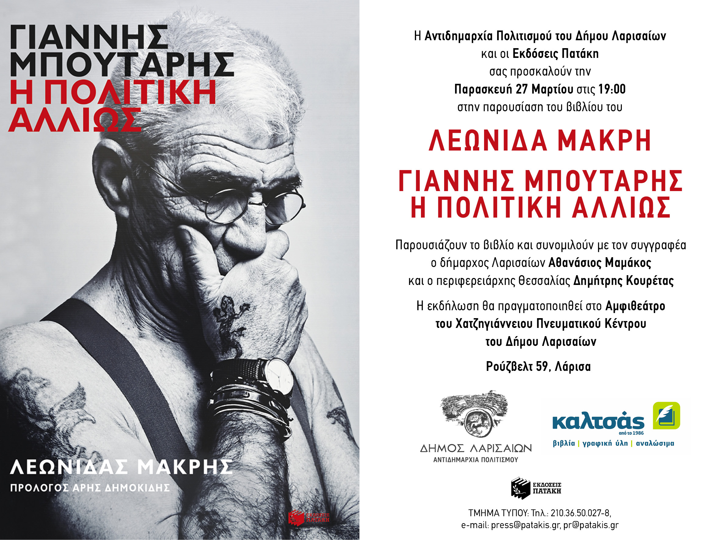 Το βιβλίο του Λεωνίδα Μακρή με τίτλο “Γιάννης Μπουτάρης-η πολιτική αλλιώς” παρουσιάζεται την Παρασκευή 27 Μαρτίου στις 19:00, στο Χατζηγιάννειο Πνευματικό Κέντρο Λάρισας (Ρούζβελτ 59) από την Αντιδημαρχία Πολιτισμού του Δήμου Λαρισαίων, τις Εκδόσεις Πατάκη και το βιβλιοπωλείο Καλτσάς.