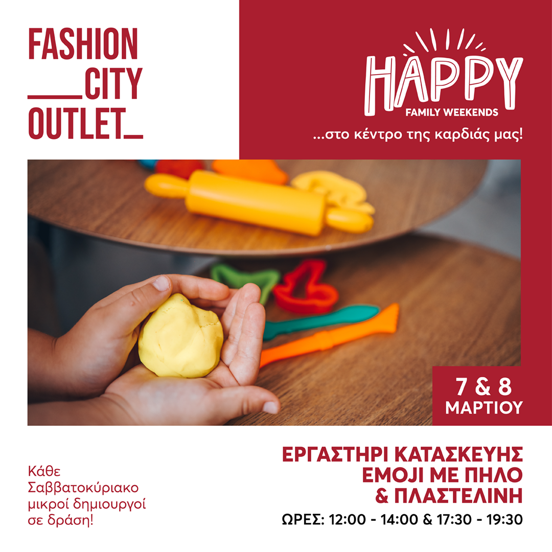 Ο Μάρτιος στο Fashion City Outlet γεμίζει χρώμα, φαντασία και παιδικά χαμόγελα με τα Happy Family Weekends — μια σειρά δημιουργικών εργαστηρίων για παιδιά που θα πραγματοποιούνται κάθε Σαββατοκύριακο, 12:00–14:00 & 17:30–19:30, με ελεύθερη είσοδο.