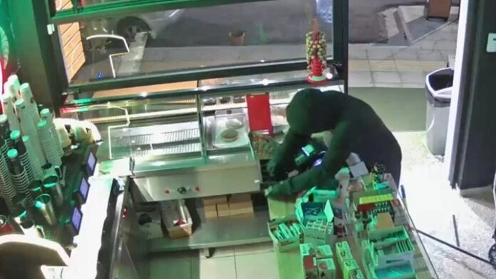 Όπως φαίνεται στο βίντεο, ένας μαυροντυμένος άνδρα που φορούσε κουκούλα ώστε να μη φαίνονται τα χαρακτηριστικά του και γάντια στα χέρια του για να μην αφήσει αποτυπώματα, έσπασε τη γυάλινη πόρτα του καταστήματος, μπήκε μέσα και αφαίρεσε χρηματικό ποσό που βρήκε στην ταμειακή μηχανή. Αφού άρπαξε και προϊόντα που υπήρχαν στον πάγκο, έσπευσε να εξαφανιστεί.