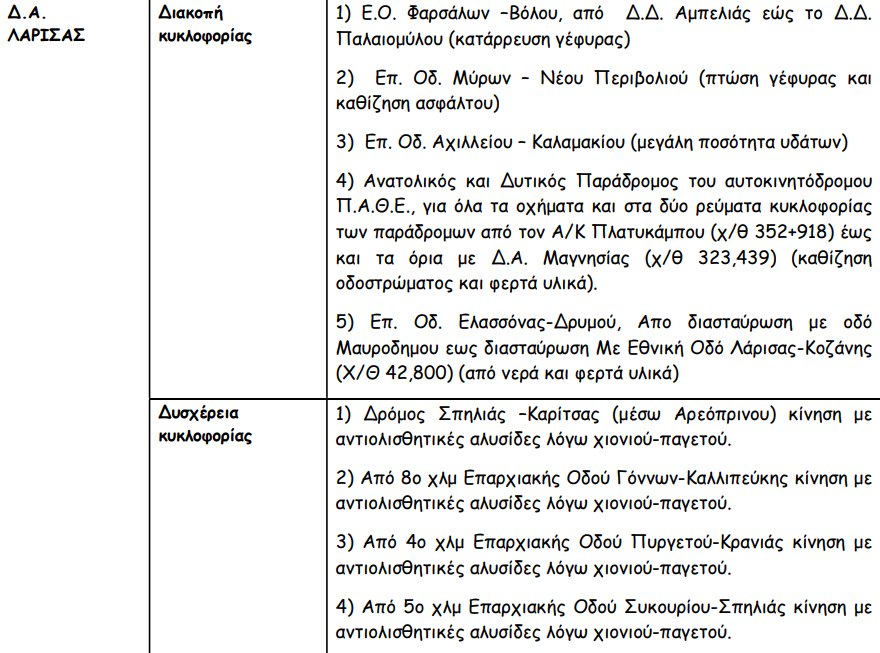 Από τη Γενική Περιφερειακή Αστυνομική Διεύθυνση Θεσσαλίας ανακοινώνεται ότι η κατάσταση στο οδικό δίκτυο της Π.Ε Λάρισας λόγω των δυσμενών καιρικών συνθηκών και των χιονοπτώσεων – παγετού σε σημεία του οδικού δικτύου έχει ως εξής:
