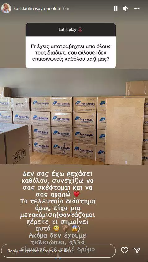 «Δεν σας έχω ξεχάσει καθόλου, συνεχίζω να σας σκέφτομαι και να σας αγαπώ! Το τελευταίο διάστημα όμως είχα μια μετακόμιση (φαντάζομαι ξέρετε τι σημαίνει αυτό). Ακόμα δεν έχουμε τελειώσει αλλά είμαστε σε καλό δρόμο» σημείωσε χαρακτηριστικά η Κωνσταντίνα Σπυροπούλου σε ιστορία που δημοσίευσε στον προσωπικό της λογαριασμό στο Instagram.