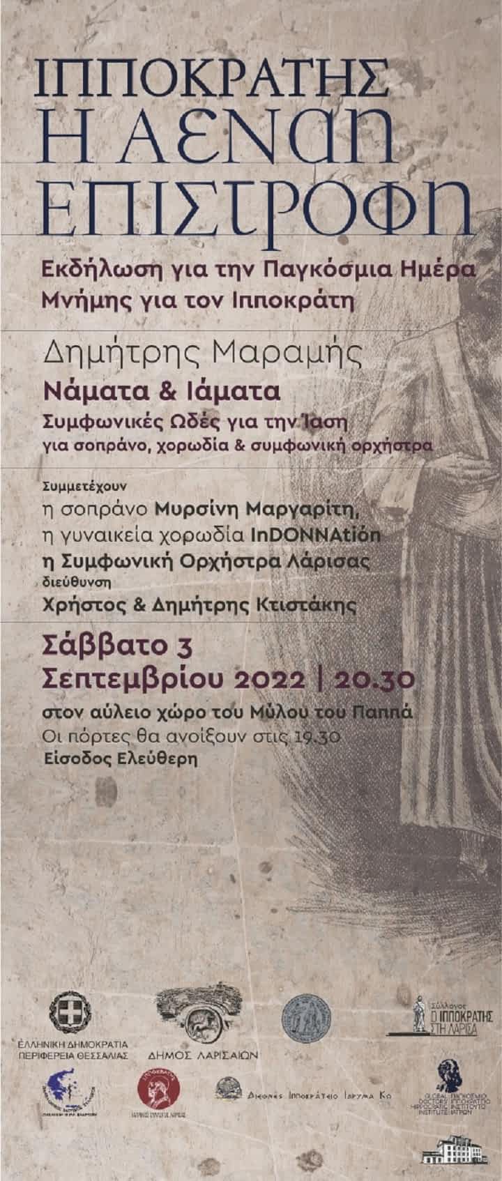 Οι εκδηλώσεις κορυφώνονται το βράδυ του Σάββατο στον αύλειο χώρο του Μύλου του Παππά, με την παρουσίαση για πρώτη φορά, νέο έργο του Δημήτρη Μαραμή, «Νάματα και Ιάματα (Συμφωνικές Ωδές για την Ίαση) με τη συμμετοχή της καταξιωμένης σοπράνο Μυρσίνης Μαργαρίτη, της βραβευμένης γυναικείας χορωδίας InDONNAtiόn και της Συμφωνικής Ορχήστρας Λάρισας υπό τη διεύθυνση των σημαντικών μαέστρων Χρήστου και Δημήτρη Κτιστάκη.