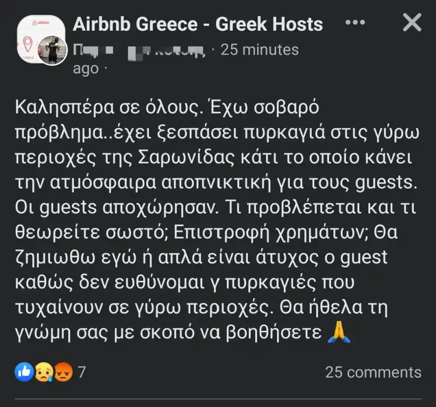 «Καλησπέρα, έχω σοβαρό πρόβλημα. Έχει ξεσπάσει πυρκαγιά στις γύρω περιοχές της Σαρωνίδας κάτι το οποίο κάνει την ατμόσφαιρα αποπνικτική για τους guests. Οι guests αποχώρησαν. Τι προβλέπεται και τι θεωρείτε σωστό; Επιστροφή χρημάτων; Θα ζημιωθώ εγώ ή απλά είναι άτυχος ο guest καθώς δεν ευθύνομαι για πυρκαγιές που τυχαίνουν σε γύρω περιοχές. Θα ήθελα την γνώμη σας με σκοπό να βοηθήσετε», έγραψε η ιδιοκτήτρια του Airbnb ειδικότερα.