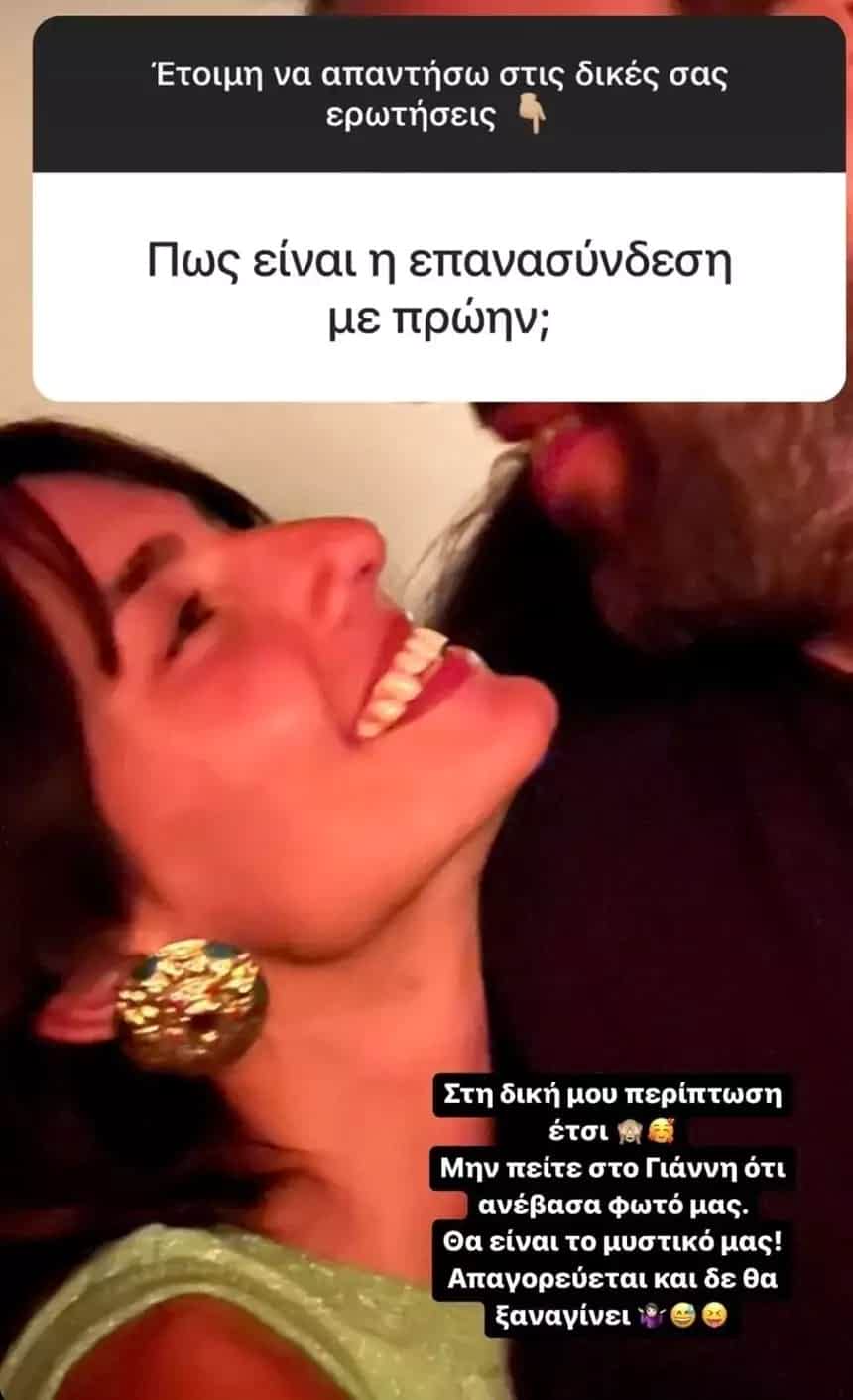 Σε ερώτηση ενός follower της παρουσιάστριας στο instagram για πως είναι η επανασύνδεση με έναν πρώην, η ίδια απάντησε αναρτώντας μία κοινή τους φωτογραφία, στην οποία φαίνεται πόσο ερωτευμένοι είναι. «Στη δική μου περίπτωση έτσι. Μην πείτε στον Γιάννη ότι ανέβασα φώτο μας. Θα είναι το μυστικό μας. Απαγορεύεται και δε θα ξαναγίνει» έγραψε πάνω στη φωτογραφία.