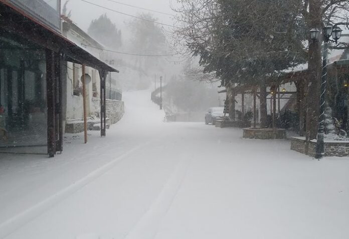 Πυκνή είναι η χιονόπτωση το πρωί της Δευτέρας στη Σπηλιά Κισσάβου.