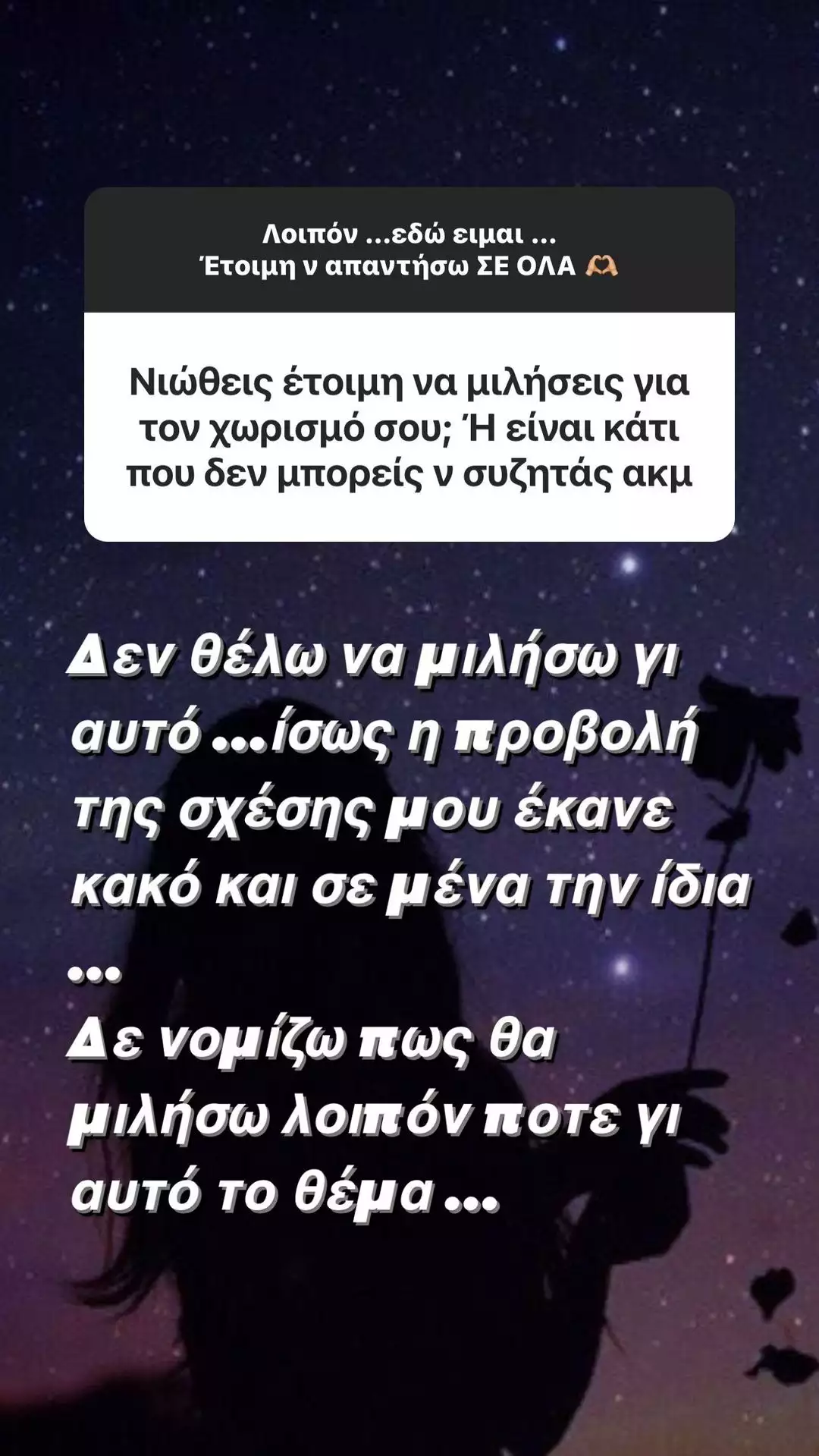 «Νιώθεις έτοιμη να μιλήσεις για τον χωρισμό σου; Ή είναι κάτι που δεν μπορείς να συζητάς ακόμα» ήταν η ερώτηση follower, με την Κατερίνα Καινούργιου να απαντά: «Δε θέλω να μιλήσω για αυτό. Ίσως η προβολή της σχέσης μου έκανε κακό και σε μένα την ίδια.. Δε νομίζω πως θα μιλήσω λοιπόν ποτέ για αυτό το θέμα».