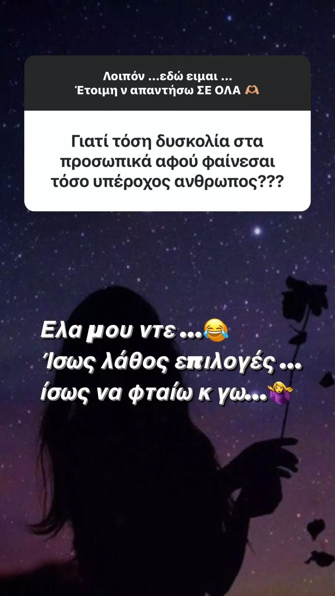 «Γιατί τόση δυσκολία στα προσωπικά, αφού φαίνεσαι τόσο υπέροχος άνθρωπος;» ρώτησε διαδικτυακός φίλος την παρουσιάστρια και η ίδια σημείωσε: «Έλα μου ντε. Ίσως λάθος επιλογές… Ίσως να φταίω και εγώ».