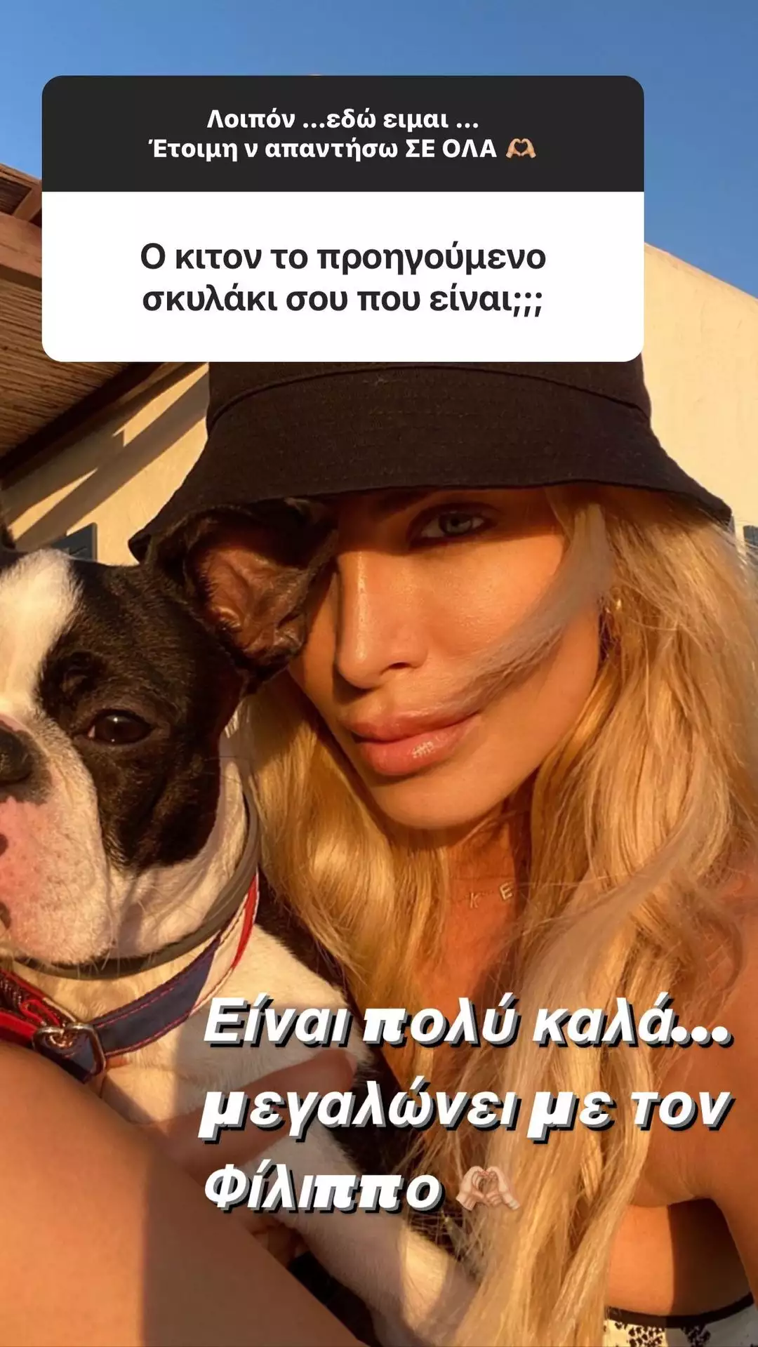 Όταν ρωτήθηκε για τον σκύλο της, τον Κίτον, η Κατερίνα Καινούργιου ανέφερε πως μεγαλώνει με τον Φίλιππο Τσαγκρίδη, κάνοντας έτσι αναφορά στον πρώην αγαπημένο της.