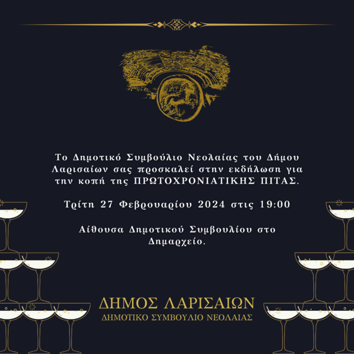 Το Δημοτικό Συμβούλιο Νεολαίας του Δήμου Λαρισαίων διοργανώνει την ετήσια εκδήλωση για την κοπή της πρωτοχρονιάτικης πίτας, η οποία θα πραγματοποιηθεί την Τρίτη, 27 Φεβρουαρίου, στις 19:00 στην αίθουσα του Δημοτικού Συμβουλίου στο Δημαρχείο.