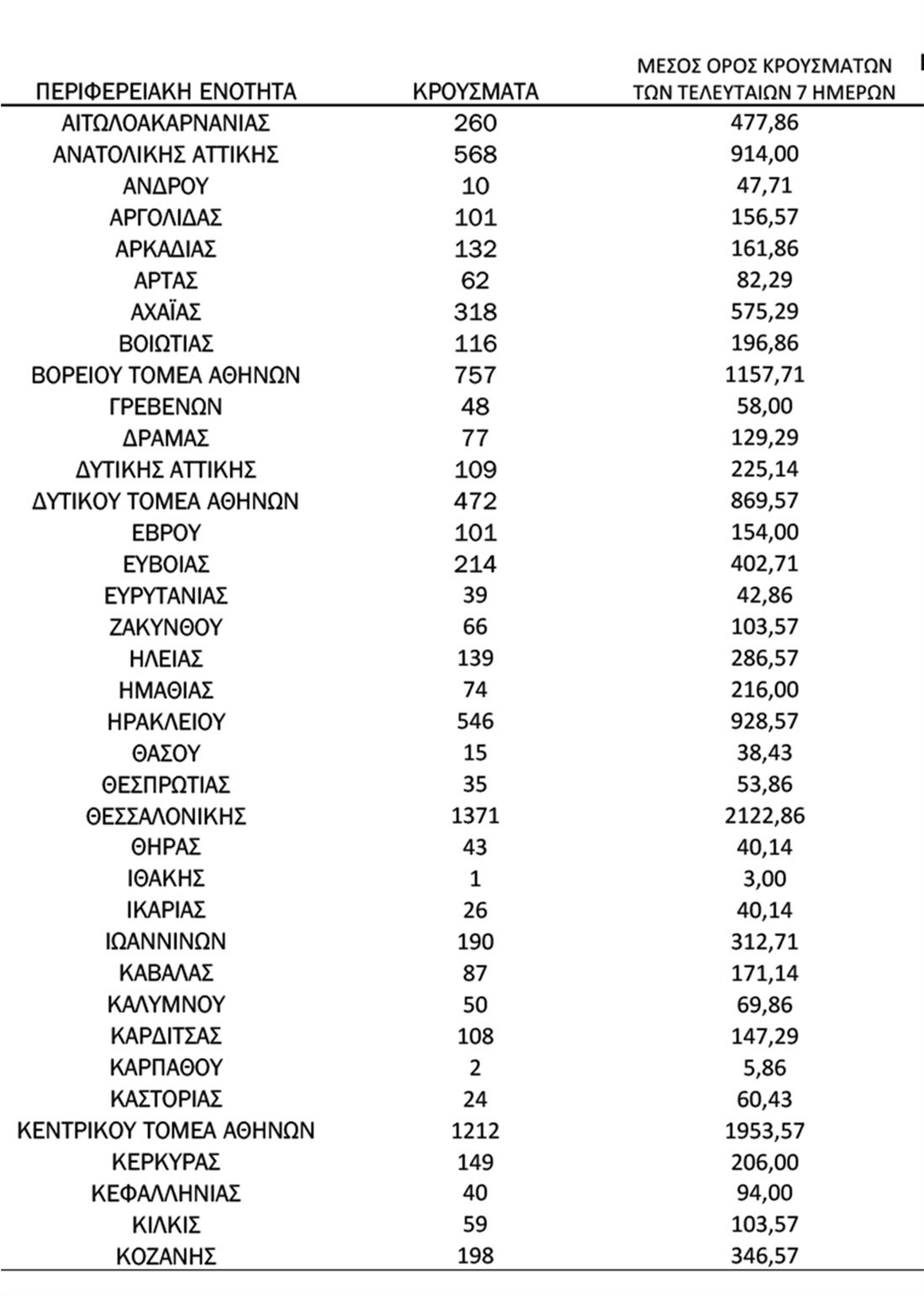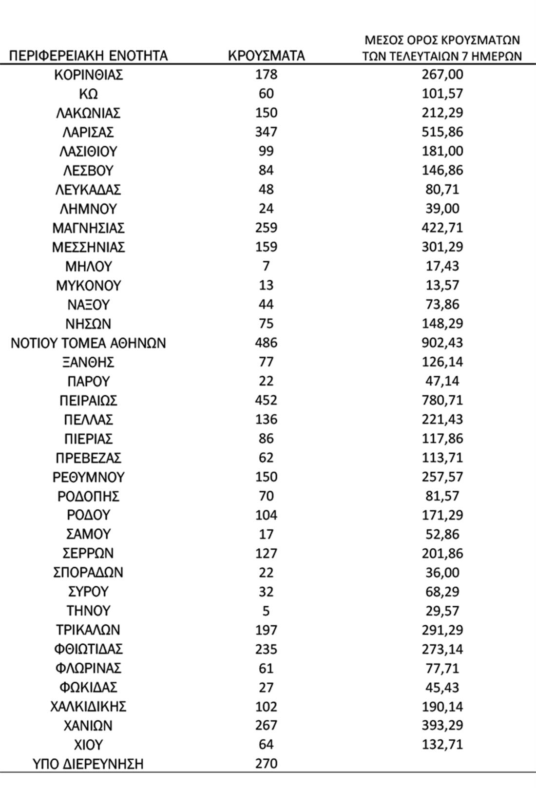 Τα νέα εργαστηριακά επιβεβαιωμένα κρούσματα της νόσου που καταγράφηκαν τις τελευταίες 24 ώρες είναι 12.462 , εκ των οποίων 24 εντοπίστηκαν κατόπιν ελέγχων στις πύλες εισόδου της χώρας. Ο συνολικός αριθμός των κρουσμάτων ανέρχεται σε 2.788.654 (ημερήσια μεταβολή +0.4%), εκ των οποίων 49.3% άνδρες. Με βάση τα επιβεβαιωμένα κρούσματα των τελευταίων 7 ημερών, 177 θεωρούνται σχετιζόμενα με ταξίδι από το εξωτερικό και 1.685 είναι σχετιζόμενα με ήδη γνωστό κρούσμα.