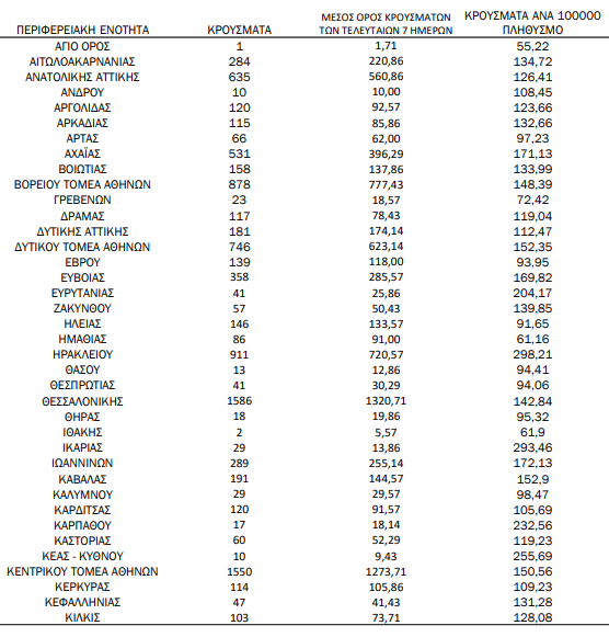 Τα νέα εργαστηριακά επιβεβαιωμένα κρούσματα της νόσου που καταγράφηκαν τις τελευταίες 24 ώρες είναι 15.557, εκ των οποίων 36 εντοπίστηκαν κατόπιν ελέγχων στις πύλες εισόδου της χώρας. Ο συνολικός αριθμός των κρουσμάτων ανέρχεται σε 2.454.429 (ημερήσια μεταβολή +0.6%), εκ των οποίων 49.5% άνδρες.