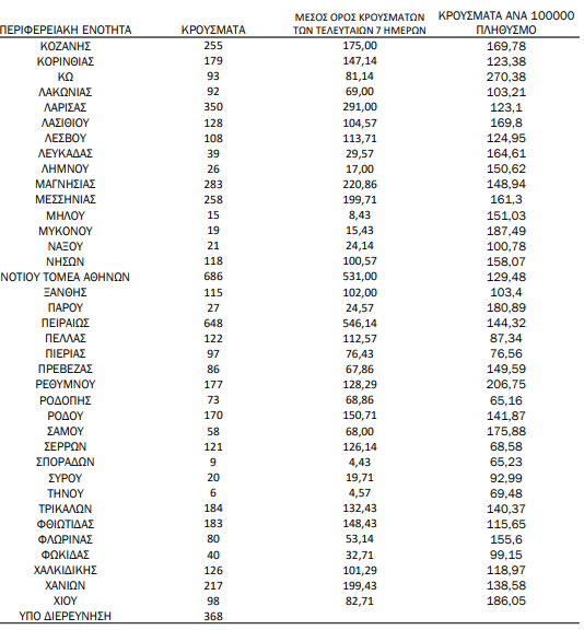 Με βάση τα επιβεβαιωμένα κρούσματα των τελευταίων 7 ημερών, 295 θεωρούνται σχετιζόμενα με ταξίδι από το εξωτερικό και 1.805 είναι σχετιζόμενα με ήδη γνωστό κρούσμα. To Rt για την επικράτεια βάσει των κρουσμάτων εκτιμάται σε 0.93 (95% ΔΕ: 0.82 – 1.01).