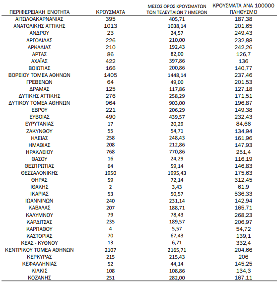 Τα νέα εργαστηριακά επιβεβαιωμένα κρούσματα της νόσου που καταγράφηκαν τις τελευταίες 24 ώρες είναι 21.102 , εκ των οποίων 14 εντοπίστηκαν κατόπιν ελέγχων στις πύλες εισόδου της χώρας. Ο συνολικός αριθμός των κρουσμάτων ανέρχεται σε 3.051.531 (ημερήσια μεταβολή +0.7%), εκ των οποίων 49.1% άνδρες. Με βάση τα επιβεβαιωμένα κρούσματα των τελευταίων 7 ημερών, 181 θεωρούνται σχετιζόμενα με ταξίδι από το εξωτερικό και 1.778 είναι σχετιζόμενα με ήδη γνωστό κρούσμα.