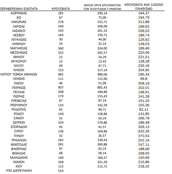 Τα νέα εργαστηριακά επιβεβαιωμένα κρούσματα της νόσου που καταγράφηκαν τις τελευταίες 24 ώρες είναι 21.102 , εκ των οποίων 14 εντοπίστηκαν κατόπιν ελέγχων στις πύλες εισόδου της χώρας. Ο συνολικός αριθμός των κρουσμάτων ανέρχεται σε 3.051.531 (ημερήσια μεταβολή +0.7%), εκ των οποίων 49.1% άνδρες. Με βάση τα επιβεβαιωμένα κρούσματα των τελευταίων 7 ημερών, 181 θεωρούνται σχετιζόμενα με ταξίδι από το εξωτερικό και 1.778 είναι σχετιζόμενα με ήδη γνωστό κρούσμα.