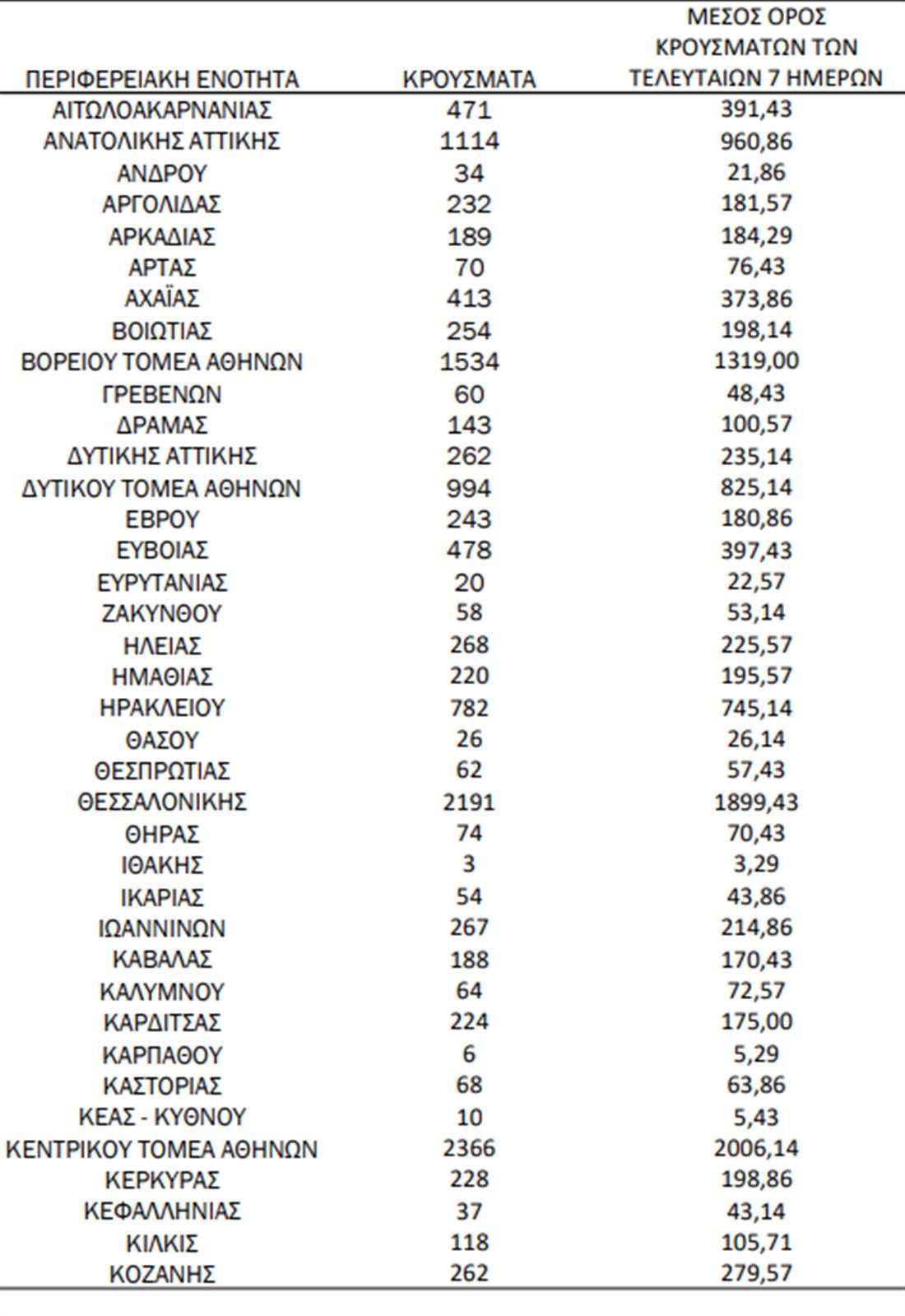 Τα νέα εργαστηριακά επιβεβαιωμένα κρούσματα της νόσου που καταγράφηκαν τις τελευταίες 24 ώρες είναι 22.451, εκ των οποίων 29 εντοπίστηκαν κατόπιν ελέγχων στις πύλες εισόδου της χώρας. Ο συνολικός αριθμός των κρουσμάτων ανέρχεται σε 3.009.333 (ημερήσια μεταβολή +0.8%), εκ των οποίων 49.2% άνδρες. Με βάση τα επιβεβαιωμένα κρούσματα των τελευταίων 7 ημερών, 189 θεωρούνται σχετιζόμενα με ταξίδι από το εξωτερικό και 1.330 είναι σχετιζόμενα με ήδη γνωστό κρούσμα.